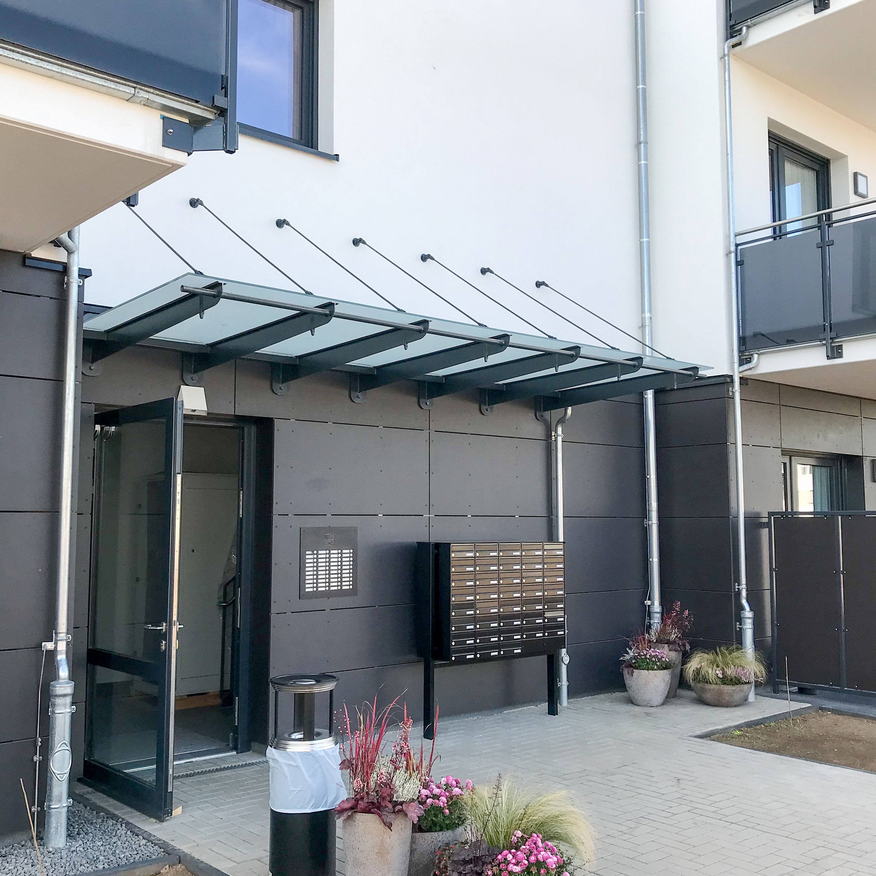 Unsere Vordächer mit Seitenschutz werden aus langlebigen Materialien wie Glas, Edelstahl oder Aluminium gefertigt und individuell an Ihre Wünsche und die Architektur Ihres Gebäudes angepasst. Ob modern, klassisch oder minimalistisch – wir kombinieren hochwertigen Wetterschutz mit einem stilvollen Erscheinungsbild, das Ihrem Eingangsbereich